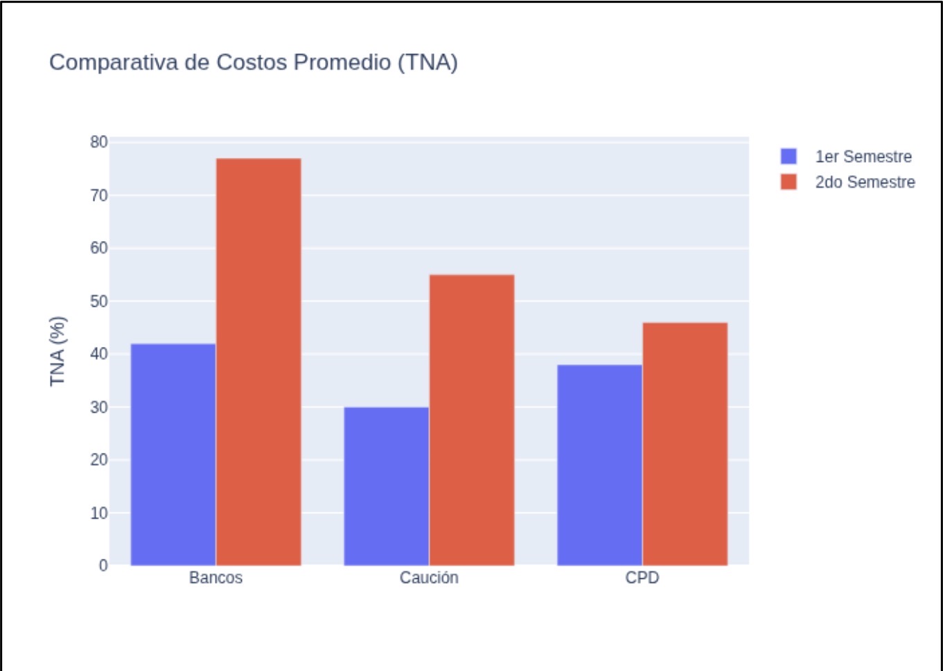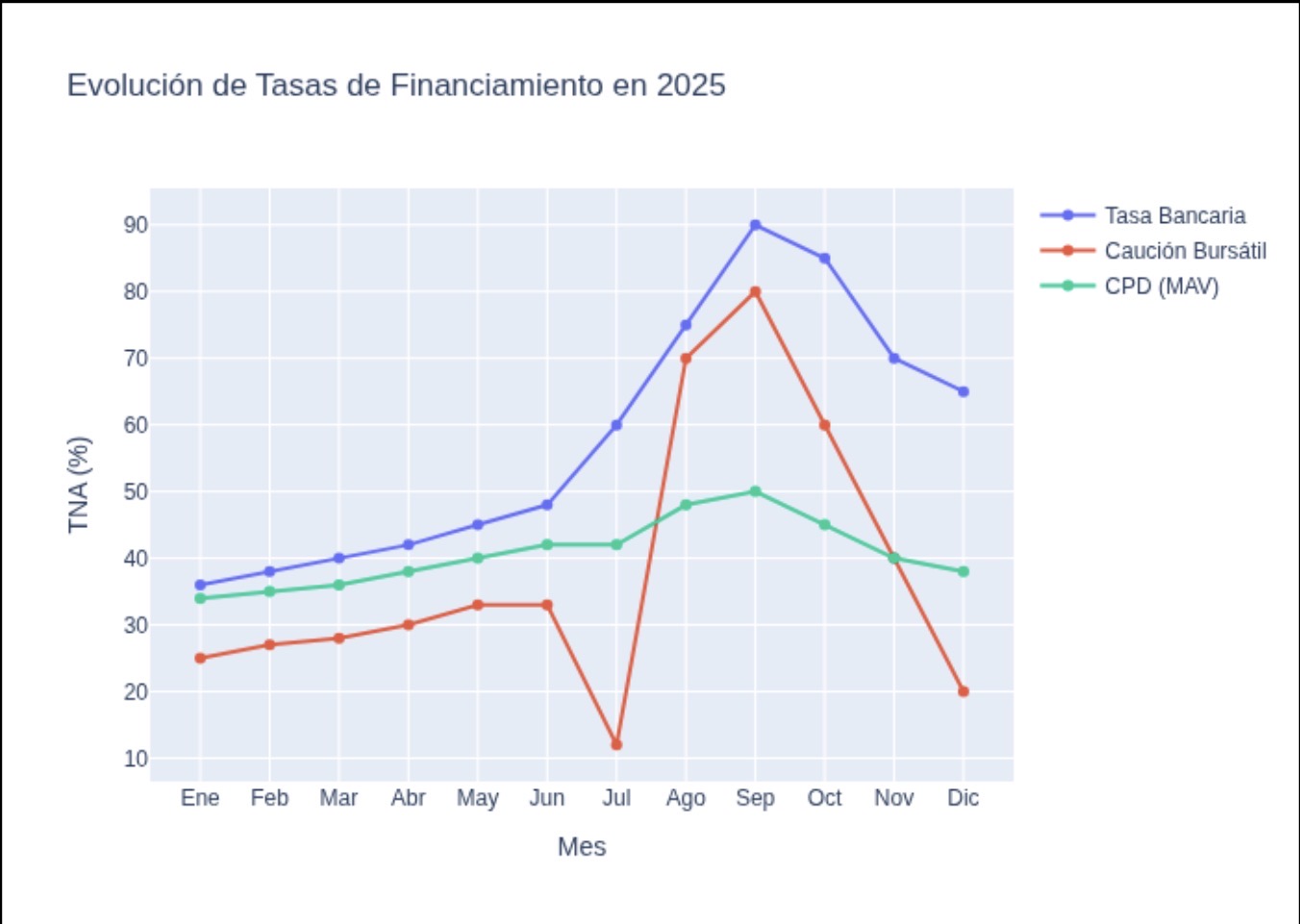 Depender exclusivamente del sistema bancario tradicional puede dejar expuesta a las empresas a riesgos de incremento de costos y disponibilidad de liquidez si no se dispone de otra alternativa como se ofrecen en el mercado bursátil. Durante el segundo semestre, las tasas bancarias para adelantos y descubiertos alcanzaron picos cercanos al 90% TNA, mientras que las alternativas del mercado de capitales, con su ya comentada volatilidad, ofrecieron costos más competitivos y mayor flexibilidad operativa.